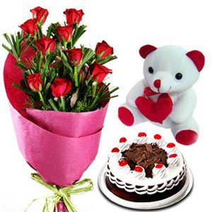 One dozen red roses bunch type bouquet w/ 8 inches teddy bear w/ pillow and choco mocha cake. A nice gift when you fall in love with someone but don't know what to offer her.