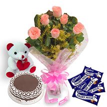 Celebrate her special day with a gift of love.send her a flower(1dozen pink rose bouquet),5 pcs cadbury 65 g each and a cake , 8 " small teddy to make it a remarkable one.