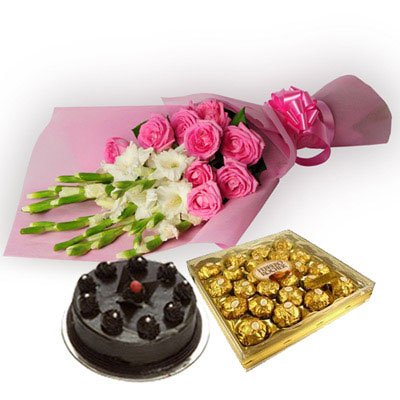 Precious MomentOne Sided bunch of 5 white Glads, 12 Pink Roses in Pink color paper packing with pink ribbon bow, 1kg chocolate truffle cake and box of Ferrero Rocher. |