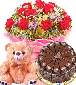 surprise1 dozen of red roses accented with greenery and fillers,9 inches bear and a chocolate cake. |
