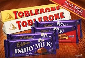 Sweet: Toblerone 200g (Milk+White)+ Cadbury 65 g(4 pcs)