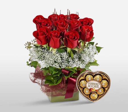Blooming LoveThe classic symbol of love for over 400 years, these carefully selected 12 red roses along withy baby breaths are well wrapped and tied with a bright ribbon in a basket along ferrero chocolate. |