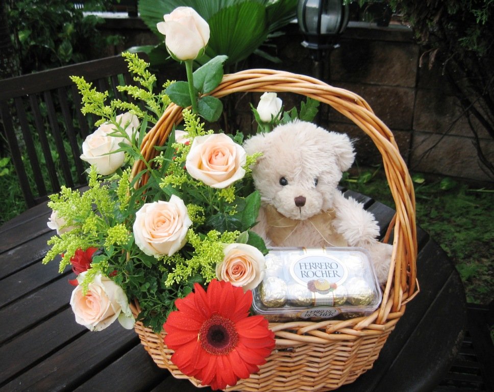 conjugal love6 Pink roses basket & 6 gerbera and 16pcs ferrero rocher with teddy in a bsaket |