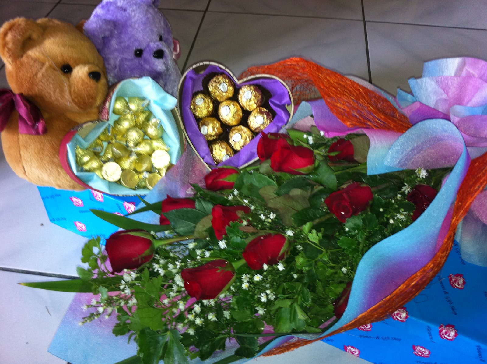 Description: Wish your near & dear ones a very happy b'day with this beautiful gift. 12 red rose bouquet,couple bear,heart shape ferrero chocolate & heart shape Hershey kisses.
