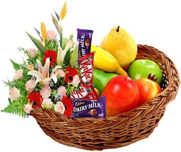 Fruits | Flowers | Chocolate5 items Fruits, Flowers , Chocolate arranged in a Basket. |