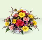 Never You FarThis sweet arrangement of yellow daisies, pink mini carnations, and hot pink carnations is complemented by purple monte casino and white waxflower. Designed in a handled basket, it's sure to send your special greetings with style. |