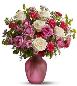Roses and spray rosesRoses, spray roses, white and pink miniature carnations and Matsumoto asters |