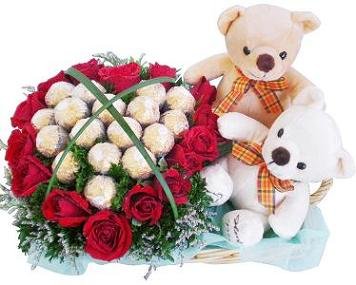 couple w/flowers & chocolatescouple w/24 red roses & 16 ferrero chocolates |