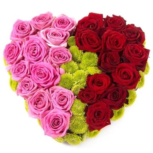 Love In Bloom Heart-Shaped flowersWith its charming colors and rich fragrance, the bouquet is sure to make someone's wishes come true! Our florists hand-arrange the stunning floral arrangement that features a select mix of fresh-cut 18 pink and 18 red lush roses and richly colorful chrysanthemums. |