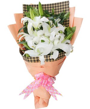 Promise of Love6 white perfume lilies. Net style crepe paper fan-shaped packed. Finished with bowknot. Delivery region limited. |