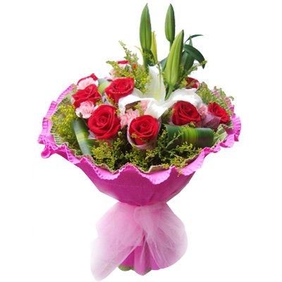 Rising BeautyDescription 12 Red roses 16 Pink carnations 2 White lilies Goldenrod flowers (Solidago) to decorate |