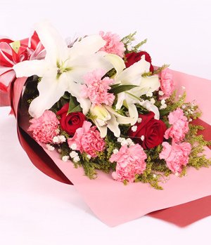 Mixed hand bouquet includes 8 pink carnations, 2 stalks white perfume lilies and 3 stem red roses for express affection like the root and the green leaves.