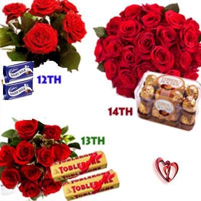 Everlasting Non Stop LoveExpress your everlasting love to your loved ones on any special ocassions with this 3 Days Serenade which includes : Day 1 feb 11 : Bunch of 6 Red Roses along with 2 60gm cadbury Chocolate Bars / Day 2 feb 12: Bunch of 12 Red Roses along with Toblerone Chocolate Bars (Net Weight : 600 Gms). / Day 3 feb 13 : Bunch of 24 Red Roses along with Box of Ferrero Rocher Chocolates (Net Weight : 200 Gms). / |