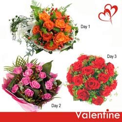 Shower Ur LoveDay 1. Buch of 12 Orange Roses.( Dely on 12th Feb) Day 2. Bunch of 12 Pink Roses. ( Dely on 13 th Feb ) Day3. Bunch of 12 Red roses. (Dely on 14th Feb) |